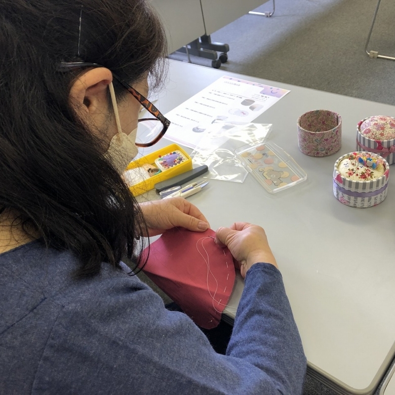 | 内 容 | はじめに好きな生地を選び、廃材の紙管にボンドで貼り付け、底面も貼り合わせて円筒を作ります。次に、針山用の生地の内側を縫い、中に綿を詰めて、糸を絞り、円筒に押し込んだら針山の完成です。 手作りの花のパーツやリボンを自由に付けて、オリジナルの作品が約1時間でできあがりました。 参加者は、できあがった針山にまち針を刺したり、「かわいい」「使うのが楽しみ」などの声が聞かれ、楽しいハンドメイドの時間となりました。 ※写真はご本人の承諾を得て掲載しています。 |