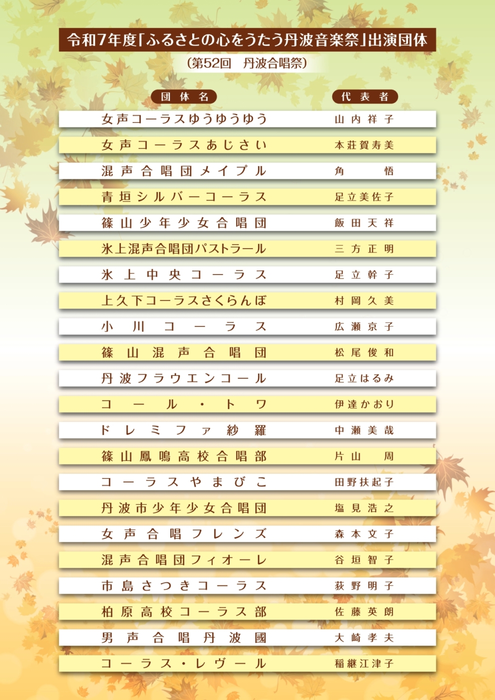 | 出演団体 | ①女声コーラスゆうゆうゆう ②女声コーラスあじさい ③混声合唱団メイプル ④青垣シルバーコーラス ⑤篠山少年少女合唱団 ⑥氷上混声合唱団パストラール ⑦氷上中央コーラス ⑧上久下コーラスさくらんぼ ⑨小川コーラス ⑩篠山混声合唱団 ⑪丹波フラウエンコール ⑫コール・トワ ⑬ドレミファ紗羅 ⑭篠山鳳鳴高校合唱部 ⑮コーラスやまびこ ⑯丹波市少年少女合唱団 ⑰女声合唱フレンズ ⑱混声合唱団フィオーレ ⑲市島さつきコーラス ⑳柏原高校コーラス部 ㉑男声合唱丹波國 ㉒コーラス・レヴール |