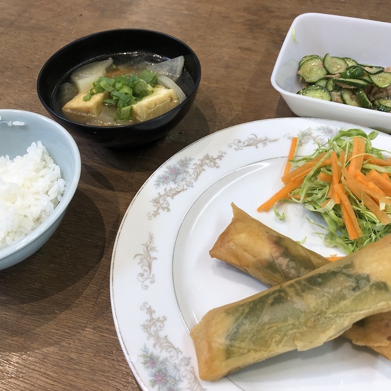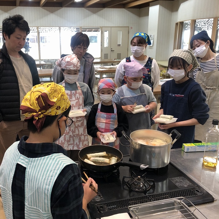 | 内 容 | 11月16日に丹波の森公苑において生活創造活動グループサポート事業「子ども料理教室」を開催しました。 最初に主催の「青空キッチン丹波篠山スクール」梶原美緒さんから、怪我をしないように色々な体験をしてほしいと話がありました。 この日は親子で参加でしたが、保護者は横で見守りながら、子どもが主役になり子ども用の包丁やピーラーを使って材料を切ったり、油であげたり、盛り付けも準備から片付けまで、すべて子ども達で行いました🍳 約1時間で春巻き、きゅうりの醤油麹あえ、中華スープが完成😊🙌 参加した子は、「また家でも作ってあげたい」「自分で作ったのでおいしい」と感想を言ってくれました😋 自ら調理することにより、野菜などの食材に興味を持ち、料理の楽しさや達成感、日頃の感謝の気持ちなど多くのことを学ぶ機会となりました。 |