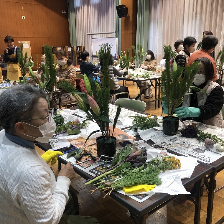 | 内 容 | 生活創造活動グループサポート事業「新年を迎える 丹波若松を飾ろう」を開催しました。 兵庫県丹波市は若松の日本三大産地のひとつで、和田地区は、種から4年の月日をかけて若松を育てておられます。 主催グループ「丹波若松同好会」代表の浅田真紀子さんは、若松の生産者でもあり、 市内に流通されることが少ない丹波若松を広く知ってもらうことを目的に活動されています。 この日は、地域内外から40名の参加があり、丹波若松と季節の花を使ったクリスマスからお正月にかけて楽しめるアレンジメントとしめ縄飾りを作りました🎍 しめ縄飾りづくりでは、藁を編む作業も体験しました🌾飾りには根の付いた松「根引き松」や縁起物のナンテンなどを使いました。根引き松は、根が付きますようにと成長を願う意味が込められているそうです。 参加者は、「毎年楽しみに参加している。今年も素敵なアレンジができてうれしい。」と喜んでおられました😊 |