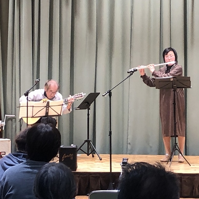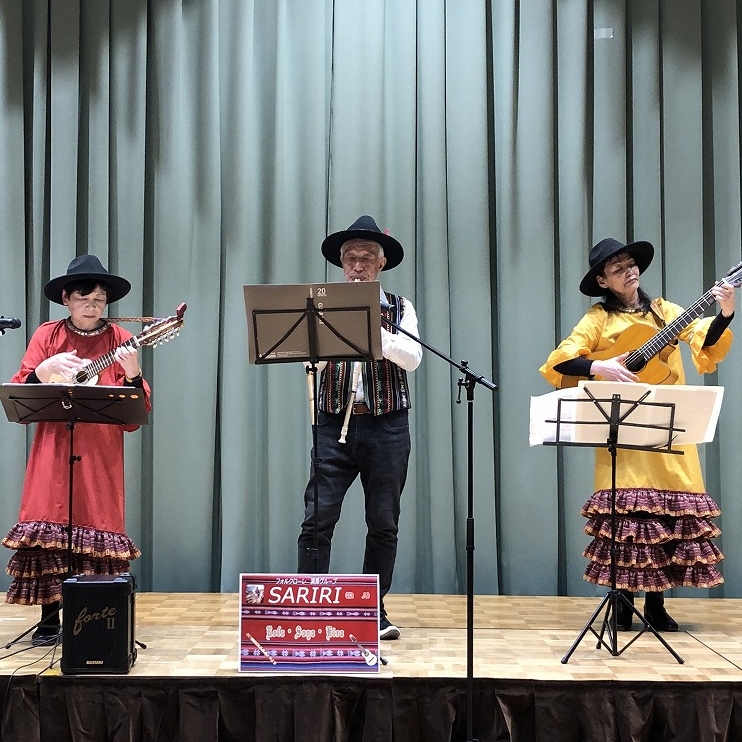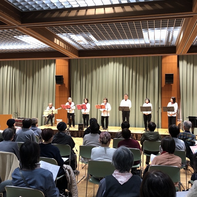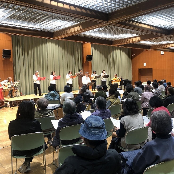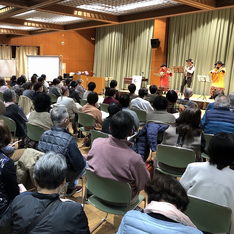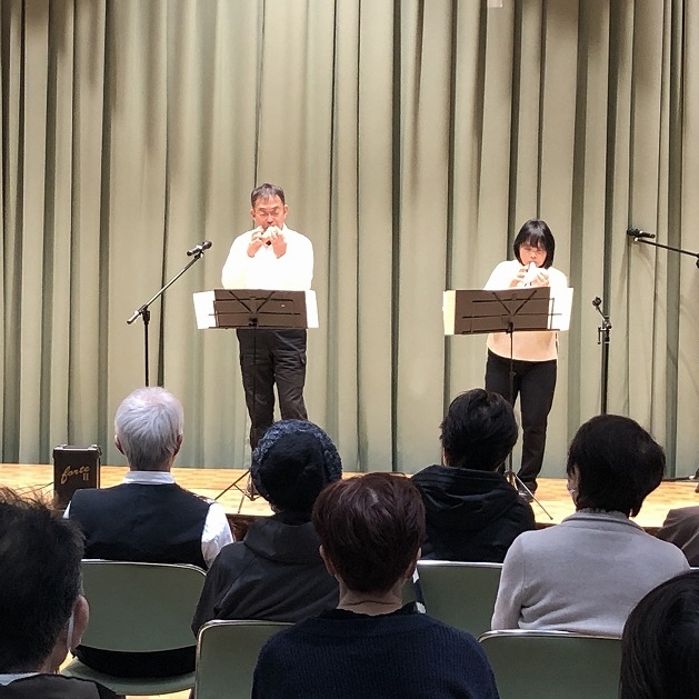 | 内 容 | 丹波の森公苑において生活創造活動グループサポート事業「ふれあい音楽隊コンサート」を開催しました。 主催のふれあい音楽隊は、OB大学卒業生を中心にOB大学在学生や音楽仲間と結成されたグループで、来場者も一緒に楽しめるコンサートを各地で開催されています。 この日は100名を超える来場者で会場は満員😊 始めに、ケーナや尺八、ギターなど民俗楽器フォルクローレの演奏で「コーヒールンバ」「コンドルは飛んでいく」など6曲が披露されました。 オカリナ演奏では音楽にあわせて来場者も口ずさみ会場は大盛り上がり🙌 アコースティックギターのソロ演奏やフルート演奏との共演もあり、最後は来場者と一緒に「花」と「ふるさと」を大合唱♪ 約2時間、終始和やかな雰囲気で楽しいコンサートになりました。 |