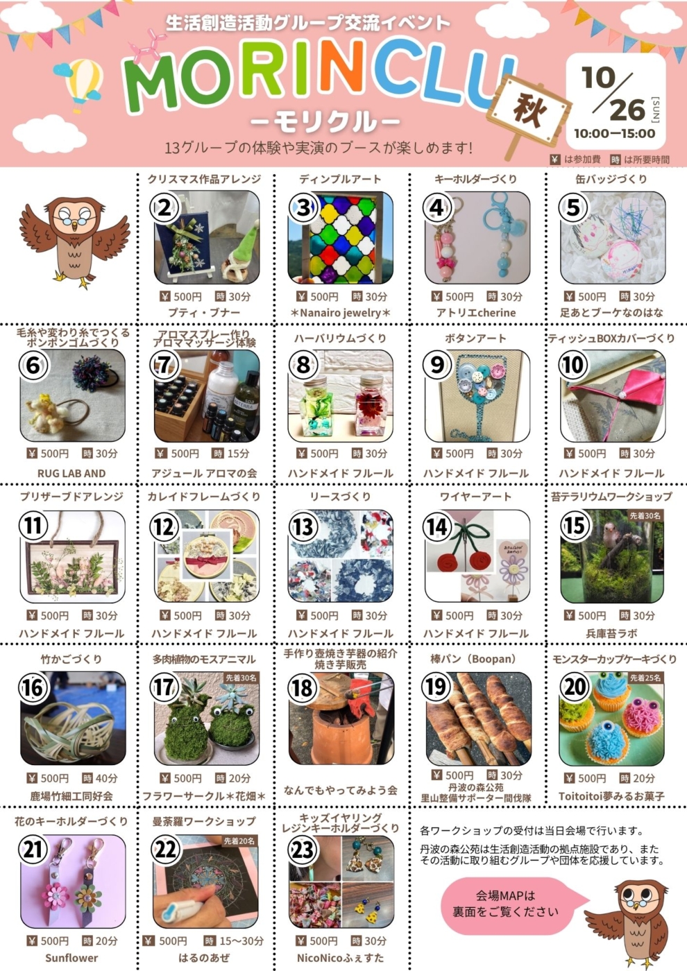 | アクセサリーづくり、布を使った作品づくり、ハーバリウム他 | 各500円 | 20分 | ハンドメイドフルール (8人のハンドメイド作家) |